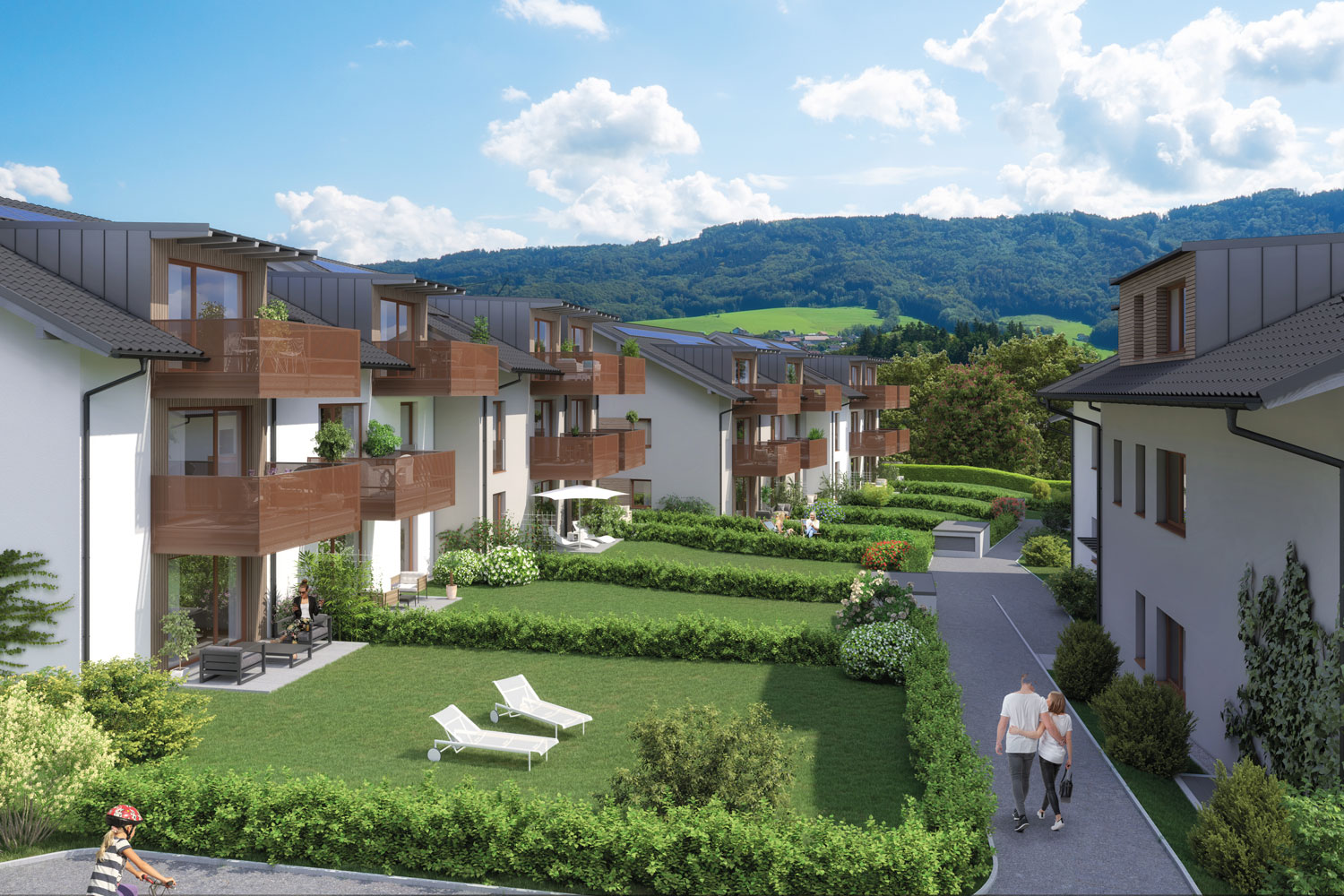 Hohe Lebensqualität – das ist das Ziel des Gesamtkonzepts. Alle Wohneinheiten der sechs Baukörper verfügen über einen ansprechenden Garten oder einen attraktiven Balkon mit Süd-West-Ausrichtung. Die Einheiten, die sich zwischen 48 m2 und 140 m2 bewegen, profitieren von intelligenten Grundrissen und der optimalen Raumnutzung. Abstellräume für Fahrräder und Kinderwägen, Wasch- und Trockenräume, private Kellerabteile, Liftanlagen in allen Baukörpern und eine Tiefgarage decken alle Bedürfnisse zeitgemäßen Wohnens. Zukunftsfähig ist neben der soliden Bauqualität auch die technische Ausstattung der Wohnanalage. Sie garantiert nicht nur Nachhaltigkeit, sondern auch optimale Betriebskosten für die Bewohner.