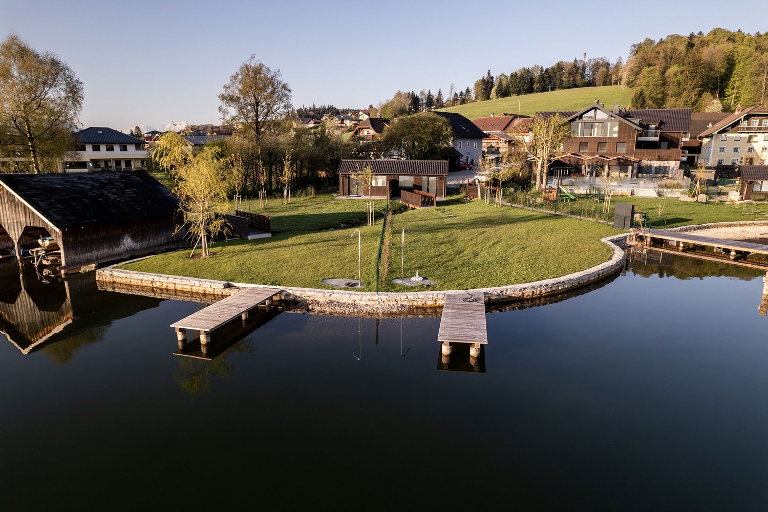 Einzigartig: Zu jedem See-Apartment gehört zudem ein eigener Badebereich mit Badehaus und -steg, das jegliches Wasservergnügen besonders komfortabel macht. Die Bootsstege verleihen Ihrem Leben am Wasser eine zusätzliche Dimension, die nur durch die einzigartige Lage des Anwesens noch übertroffen wird.
